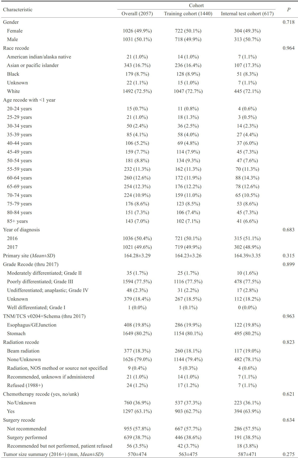 Abstract:ObjectiveToanalyzethediferencesintheprognosisofgastricsignetringcellcarcinoma(SRCC)amongdifferent racesusingtheUS Surveilance Epidemiologyand EndResults(SEER)database andTheCancerGenomeAtlas (TCGA) database.Methods Weanalyzedthedataofpatients withgastricSRCCfromtheSEERdatabasefrom200to2020,anddivided thepatientsintocohortsofitesblackssiasoracificnders,AmericanIdians/Alaskaativesacordingtoace. The prognosis and treatmentof the cohorts were evaluated using baseline demographic analysis, Kamplan-Meier survival curve, and nomogram analysis. Results We analyzed the data of a total of 2058 patients, including 8.6% blacks, 72.4% whites, 16.6% Asians or Pacific Islanders, 1.0% American Indians/Alaska Natives, and 1.4% other races. The tumor grade varied among diferentracesnderevalecadalatsoftietsdidgnicantlycossces.irecsineite cohort were the most prominent,and all the differences were statistically significant (P<0.05) . Racial differences were also noted inpatientmanagementandprognosis.ConclusionThereareacialdifferencesintumor gradesandprognosisof gastric SRCC,andthesedifferencesprovideevidenceforoptimzingclinicaldagnosisandtreatmentstrategiesforthismalignancy. Keywords: signet ring cellcarcinoma; racial differences;SEERanalysis; columnar plots;TCGAdatabase