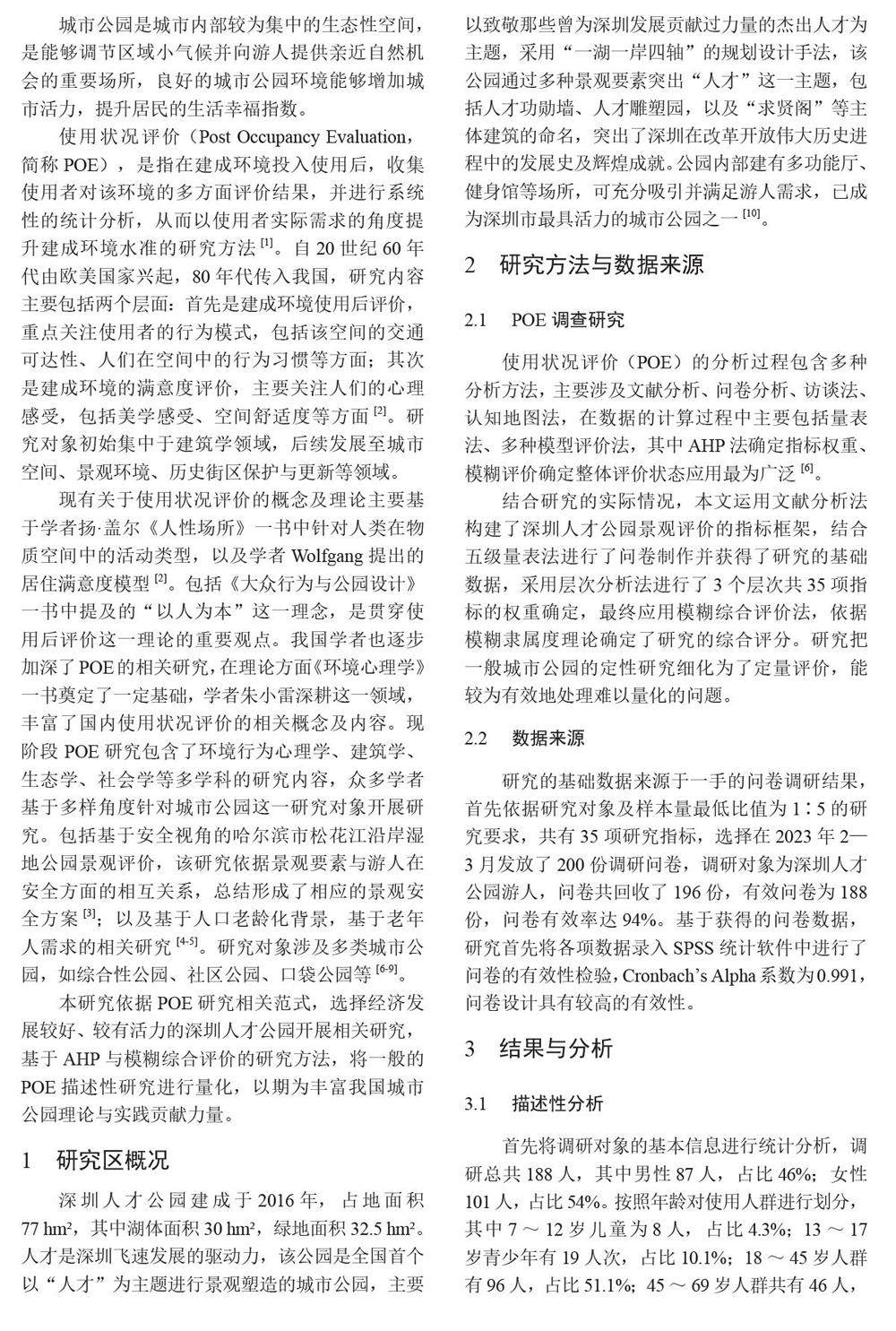 摘 要:【目的】深圳作为全国经济中心城市、国际花园城市,其经济发展及城市景观设计手法对于其他区域具有借鉴意义。以构建的评价体系为依据可对深圳人才公园景观提升指明方向,从而形成对其他城市公园景观建设工作的对比参照,并对城市公园景观量化评价工作进行补充完善。【方法】采用使用后评价(POE)方法,以深圳人才公园景观建设满意度为研究目标,建立了深圳人才公园景观评价指标体系,共选取5 个方面35 项指标进行了问卷调查和数据收集,并基于AHP 法构建了各层指标的评判矩阵,获得各项指标权重,最终依靠模糊综合评价法形成了深圳人才公园景观满意度评价结果。(剩余412字)