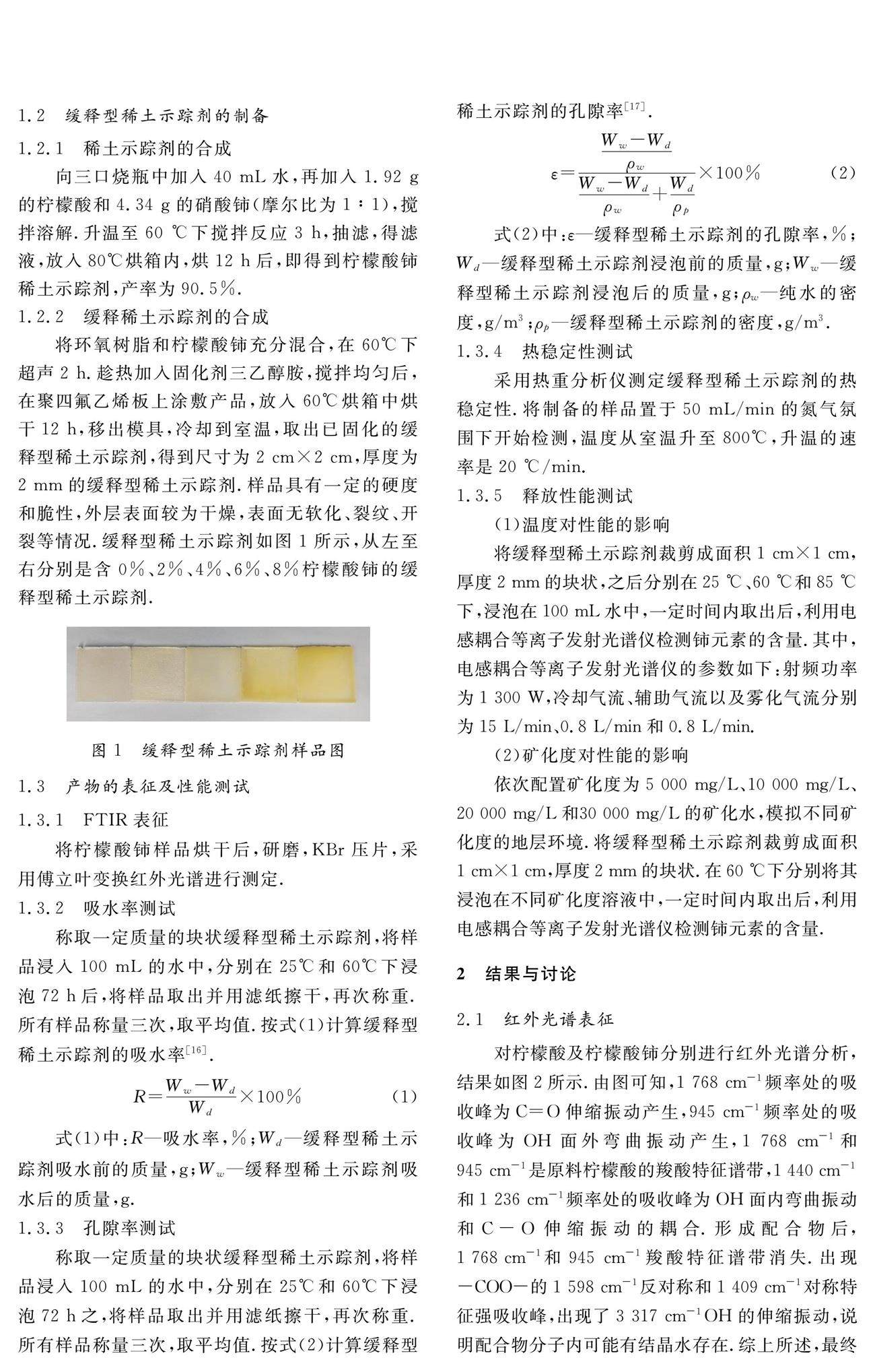 摘 要:为了实现对水平井的出水位点和产液剖面的长期监测,研发高性能缓释示踪剂至关重要.本论文首先以柠檬酸和硝酸铈为原料合成了柠檬酸铈稀土示踪剂,然后将其与环氧树脂混合,在三乙醇胺的固化作用下制备了缓释型稀土示踪剂.研究了示踪剂的吸水性能、热稳定性以及释放性能,并对释放曲线进行了数学模拟,探讨了示踪剂(剩余10346字)