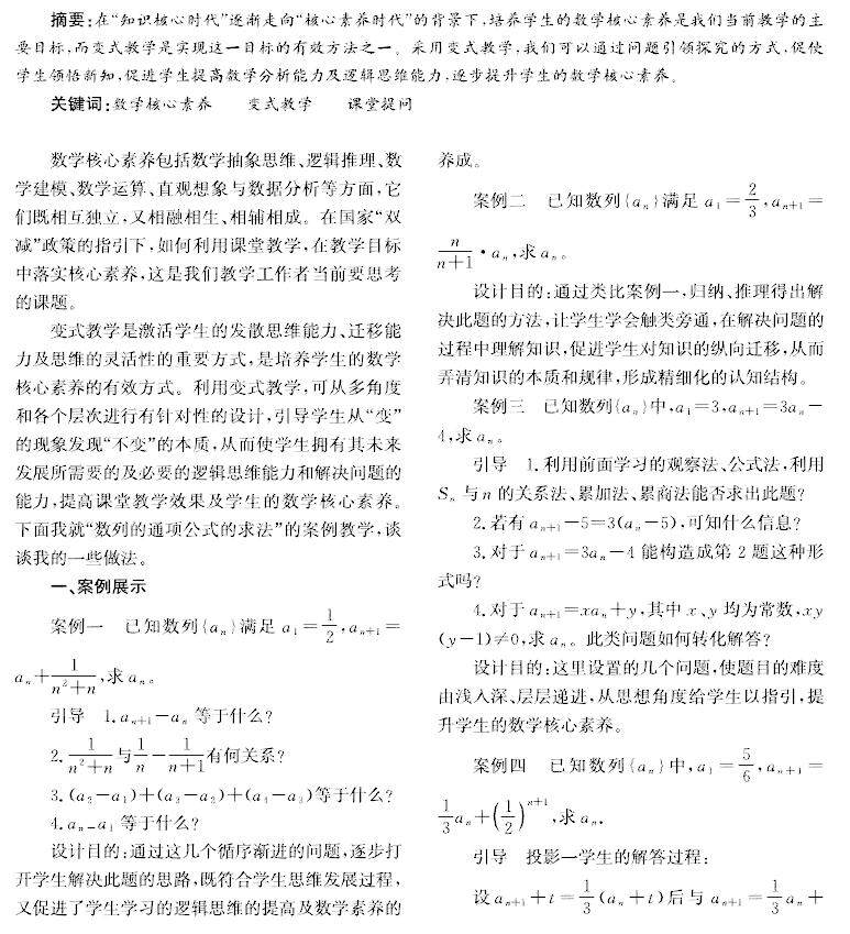 摘要:在“知识核心时代”逐渐走向“核心素养时代”的背景下,培养学生的数学核心素养是我们当前教学的主要目标,而变式教学是实现这一目标的有效方法之一。采用变式教学,我们可以通过问题引领探究的方式,促使学生领悟新知,促进学生提高数学分析能力及逻辑思维能力,逐步提升学生的数学核心素养。