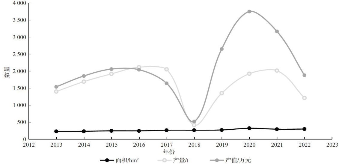 AbstractThis article adopted methods such as questionnaire surveys and on-site visits to analyze the changing trendsof apple plantingand production in Mentougou District,Beijing from 2O13 to 2O22,thecurent situationof production management in plantations,as well as the aspects that need improvement inthe developmentof theapple industry,and countermeasures and suggestions were put forward.The results showed thatthe apple planting area in he study area had shown a slight increasing trend in 2013-2O22.Based on the planting and management characteristics of apple orchards,the orchards were clasified into 4 types through cluster analysis.Among them,type I had a relatively high economic return,with itssingleorchard area,single yield,and single output value all exceeding thoseof other types.The apple industry in this area needs improvement in aspectssuch as industrial development planning, departmental responsibilities,production entities,production management techniques,and industrial promotion.Based onthis,itis proposed tosummarize thekeytechnical parameterssuch asvarietyselection,densitycontrol,andfield management for high yield orchards,form replicablehigh qualityproduction technologyregulations,strengthenthe cultivation and managementof mediumandlow yieldorchards,implement varietyrenewalandreplacement,optimize planting density and tree structure,introduce common technologies such as seedling raising and fertilization,share mechanical equipmentand technical personnel,andcultivate joint productionentities Actively promoteand apply modern fruit tree production management technologies such as mechanized farming,integrated water and fertilizer management,and greenpestand diseasecontrol,and createcharacteristic fruit brandsandother countermeasures and suggestions, to provide references for the high-quality development of the apple industry.