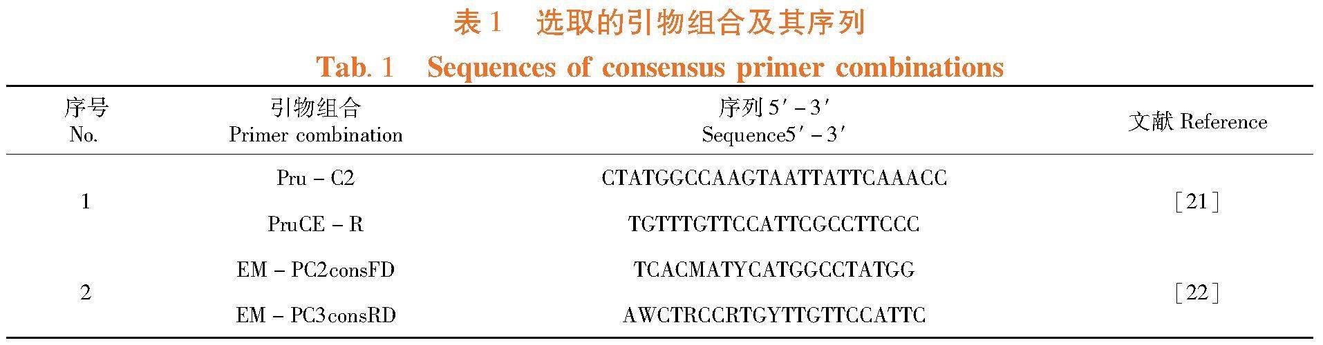 【方法】利用2对蔷薇科通用引物对9个欧洲李品种的叶片基因组DNA进行特异性PCR扩增,片段回收,将克隆测序的结果在GenBank数据库中进行同源性比对并分析序列。