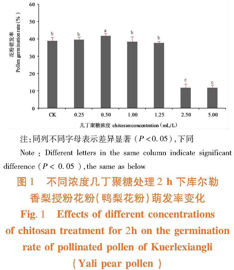 摘 要:【目的】在库尔勒香梨授粉液中添加几丁聚糖,研究植物免疫诱抗剂几丁聚糖对花粉活力、香梨树坐果率及果实品质的影响,筛选出最佳的几丁聚糖喷施浓度,为生产上合理利用几丁聚糖提高香梨坐果率及改善果实品质提供理论依据。