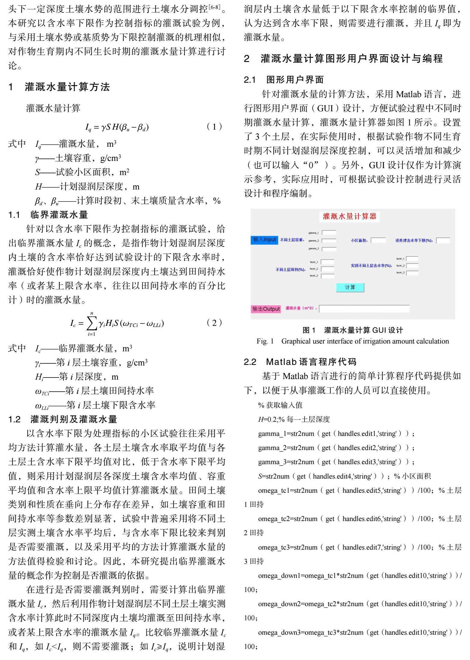 摘 要: 针对以不同含水率下限为控制指标的小区灌溉试验,提出了临界灌溉水量概念作为是否需要灌溉的判断依据,从而计算灌溉水量。为了便于计算试验不同时期灌溉水量,应用Matlab 语言进行图形用户界面(GUI)设计。采用温室架豆需水规律试验测试结荚期土壤含水率数据,水量临界判别法与平均方法计算结果对比表明,两种方法的灌溉判别与灌溉水量计算结果差别较大,主要由土壤容重与田间持水率差异引起。(剩余6102字)