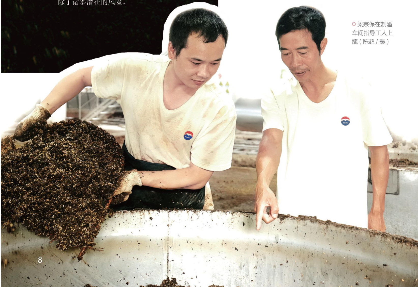 在梁宗保的办公室等候时,我本以为会见到一位西装革履的管理者。未曾想,他身穿汗渍斑斑的工装,脚踩拖鞋,脚趾上还沾着黑色酒糟,风尘仆仆出现在眼前。