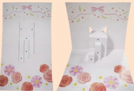 把各个部件剪好。注意,红色线须用美工刀切开。使用双面胶粘贴可以让贺卡更平整。