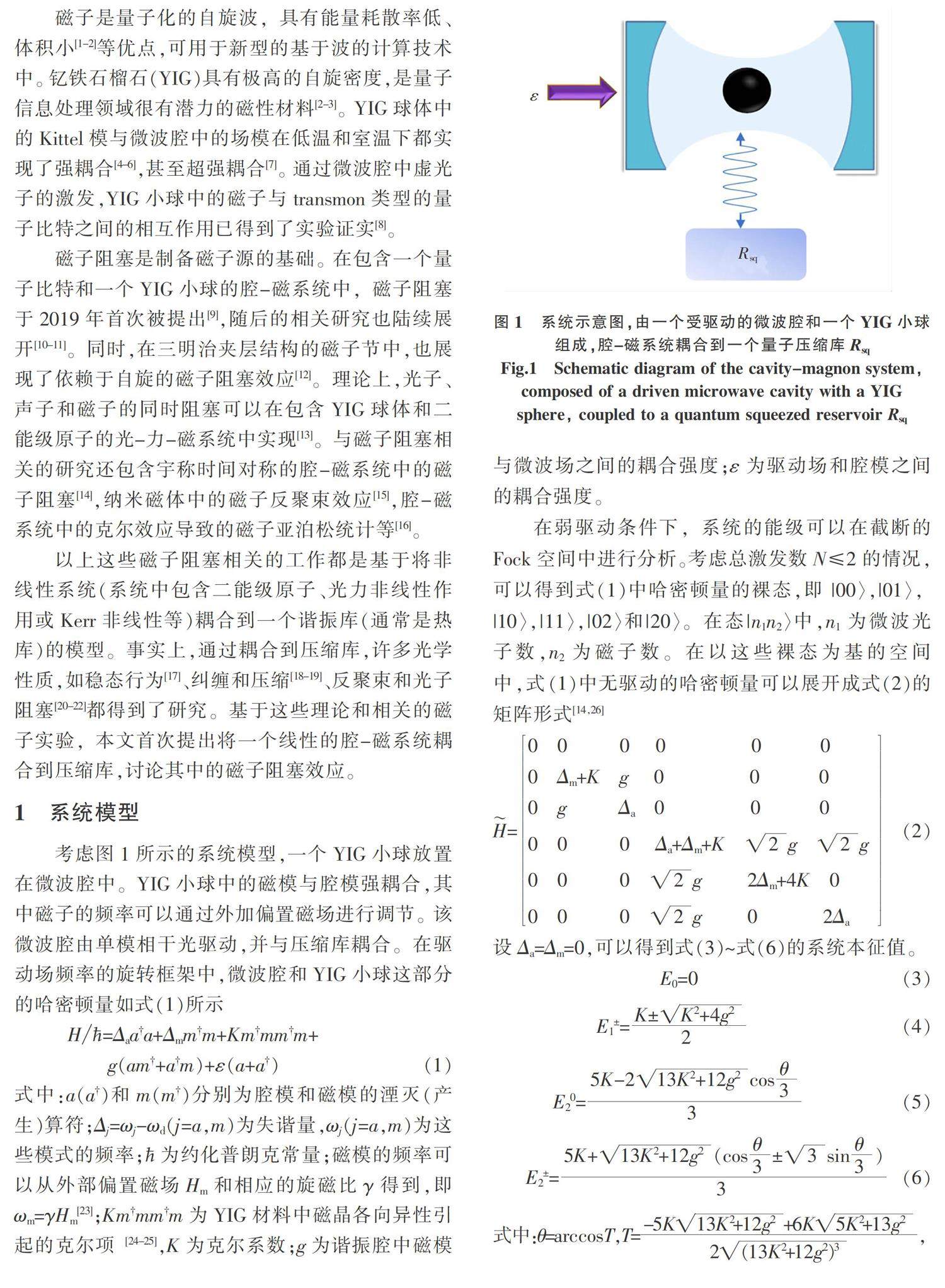 摘要:基于近年来微波腔与磁子相互作用的实验进展以及非线性库理论,提出将腔-磁系统与压缩库耦合,分析其中的磁子阻塞效应,以实现磁性量子级的操控。在一个受驱动的微波腔中放置一个钇铁石榴石小球,球体中的Kittel模与微波腔模耦合,同时腔场与压缩真空库耦合。通过数值求解系统的量子主方程,详细分析了关联函数受耦合强度、失谐量、耗散率等因素的影响。(剩余13091字)