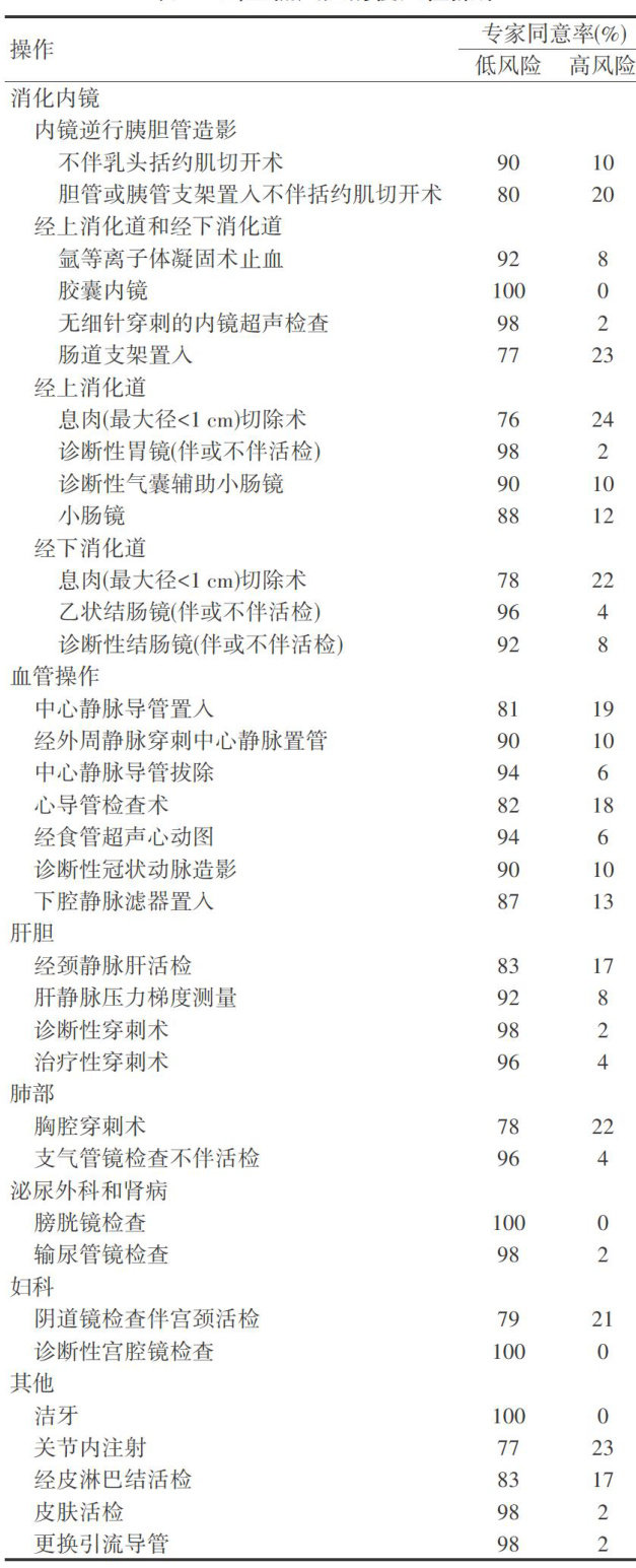 AbstractAlthough there are several risk clasificationand management guidelines for invasive procedures in cirrhotic patients,consensusonthe bleedingriskand thresholdsof hemostaticparameters hasnotbeenachieved.The purposeof this consensus is toestablish an expert opinionon the bleeding risk associated with invasive procedures in cirhotic patients,categorizing 8Oproceduresas"highrisk"and "lowrisk".Theconsensus also informs physiciansof the laboratory tresholdsforplateletcount,nternationalnormalizedratio,fibinogen,andactivatedpartialthromboplastintime thatexperts consideracceptable for elective invasiveprocedures inpatientswithcirrhosis.Thisexperience-based clasification may helprefinefuture research designand guideclinical decision-making forinvasiveprocedures incirhotic patients.