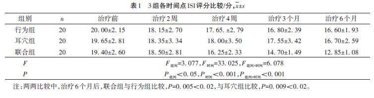 摘 要:目的:探讨耳穴压豆联合失眠认知行为团体治疗对更年期女性失眠症的疗效。方法:选取60例更年期女性失眠患者为研究对象,采用随机数字表法将其分为联合组(耳穴压豆联合失眠认知行为团体治疗)、行为组(失眠认知行为团体治疗)和耳穴组(耳穴压豆治疗),每组20例。采用失眠严重程度量表(Insomnia severity index,ISI)、健康调查简表(Short form 36 health survey,SF-36)、匹兹堡睡眠质量指数量表(Pittsburgh sleep quality index,PSQI)对3组各时间点睡眠感受、生活质量以及睡眠质量进行评估。(剩余9752字)