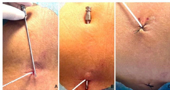 Abstract:Objective:Toevaluatethepostoperativecomplicationsofmodifiedtunnellumbarcisterndrainageforaneurysmal subarachnoid hemorrhage(aSAH).Methods:Aretrospectiveanalysis wasconductedonthedataof86aSAHpatients admited fromOctober 2O21 toDecember 2024.According tothecerebrospinal fluid drainage method,the patients were divdedinto traditional groupandimproved groups,with43casesineachgroup.Inthetraditionalgroup,L3/4orL4/5 lumbar puncture wasperformedaccording to thestandard procedure,and thecatheter wasplaced subdural about10-15cm, fixedwithadressng,andconnected toacloseddrainage system.Thedrainage heightwas maintainedat15-2Ocmabove theexternal auditorycanalline.Inthe modified group,aftersuccessulcatheterizationas inthe traditional group,a 0.5 cm incision was made at the puncture site,and a subcutaneous tunnel >5 cm was established using a puncture needle. The catheter was placed inthesubcutaneous tunnelandanother incision was made to lead itout.The tunnel exit was fixed with a cross suture.The postoperative complications wereobserved in two groups of patients,including intracranial infection,catheter displacement,cerebrospinal fluid leakage,catheter blockage,andunplanned catheterremoval.Results:Theincidenceofintracranialinfection,catheterdisplacement,andunplannedcatheterremovalinhemodified group was lower than those in the traditional group,with statistically significant difference( P<0.05 ).There was no statisticallysignificant diference in cerebrospinal fluid leakageand catheter blockage between the two groups ( P>0.05 )Conclusion:The modified tunneled lumbar cistern drainage techniquecan efectivelyreducetheincidenceof intracranial infection,catheter displacement,and unplanned catheter removal in aSAH patients.