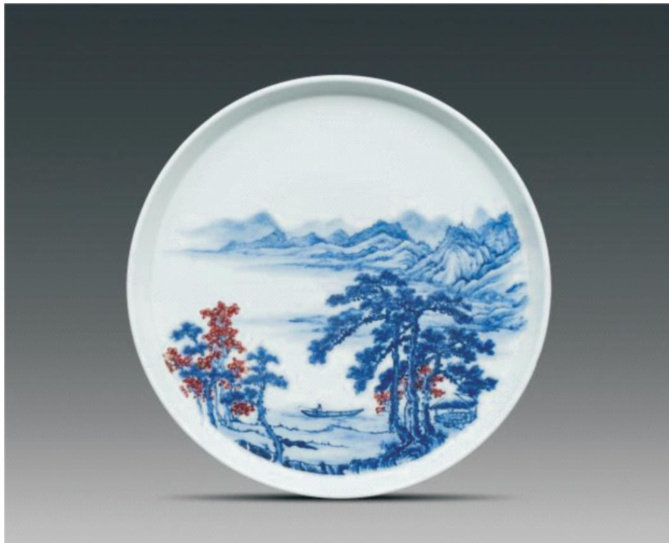 青花釉里红山水瓷画有其特有的表现形式与艺术风格,釉里红发色娇妍而沉着,色调浓郁,流动性强,因此不能产生深浅层次的变化;青花呈色稳定,类似于墨汁,有着“青花墨分五彩”之说,效果与文人写意画如出一辙。因此,青花弥补了釉里红层次变化的不足,釉里红则丰富了青花的色彩,增加了画面的情趣。青花、釉里红在画面中相互衬托,一红一蓝,既有青花的“幽蓝雅致,沉静安稳”,又加上了釉里红的浑厚壮丽,丰富了视觉效果,形成了朴实而又华贵的艺术风格。(剩余3527字)