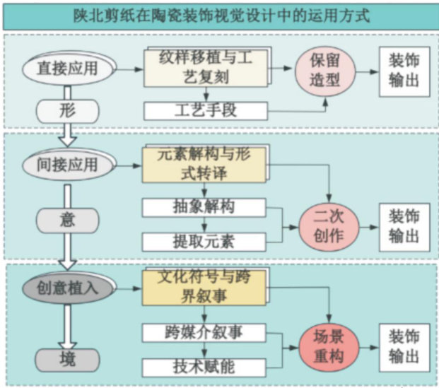【摘要】陕北剪纸作为中国民间艺术的瑰宝,以其粗扩豪放的风格、质朴生动的造型和深厚的文化内涵,成为传统视觉符号的典型代表。文章梳理了陕北剪纸的艺术特征、文化内涵及艺术价值;结合陕北剪纸特点与陶瓷装饰需求,遵循“形→意→境”的递进原则,从直接应用、间接应用、创意植入方面提出陕北剪纸在陶瓷装饰视觉设计中的运用思路,为传统手工艺的当代转化提供参考。(剩余3924字)