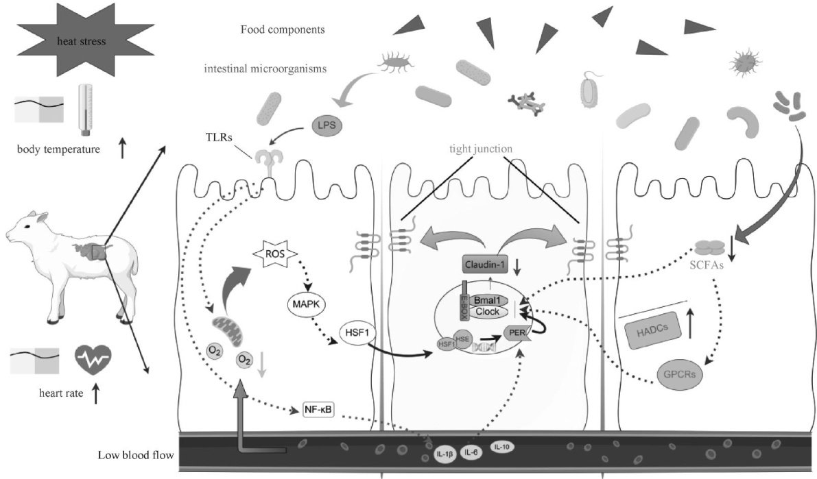 Abstract: In recent years,as the global greenhouse effect has become more serious, frequent extreme weather has caused huge economic losses to animal husbandry. Especially in the summer when heat waves are frequent, continuous high temperatures can cause heat stress reactions in ruminants,resulting in stunted growth and development, increased mortality,and serious restrictions on the high-quality development of animal husbandry. Studies have found that heat stress has a particularly significant impact on the intestinal health of young ruminants,causing disordered intestinal microbial flora structure,oxidative stress damage,and increased barrier permeability. However,most existing studies only explore intestinal damage caused by heat stress at a single time point,but the latest research reveals that intestinal barrier function is not static but shows circadian rhythmic changes. To this end,this article reviews the effects of heat stress on the circadian rhythm of the digestive tract biological clock and barrier function of ruminants on a diurnal time scale,in order to find potential pathways and mechanisms for heat stress to regulate digestive tract barrier function through the biological clock,and provide new ideas for precise production and environmental management of ruminants.