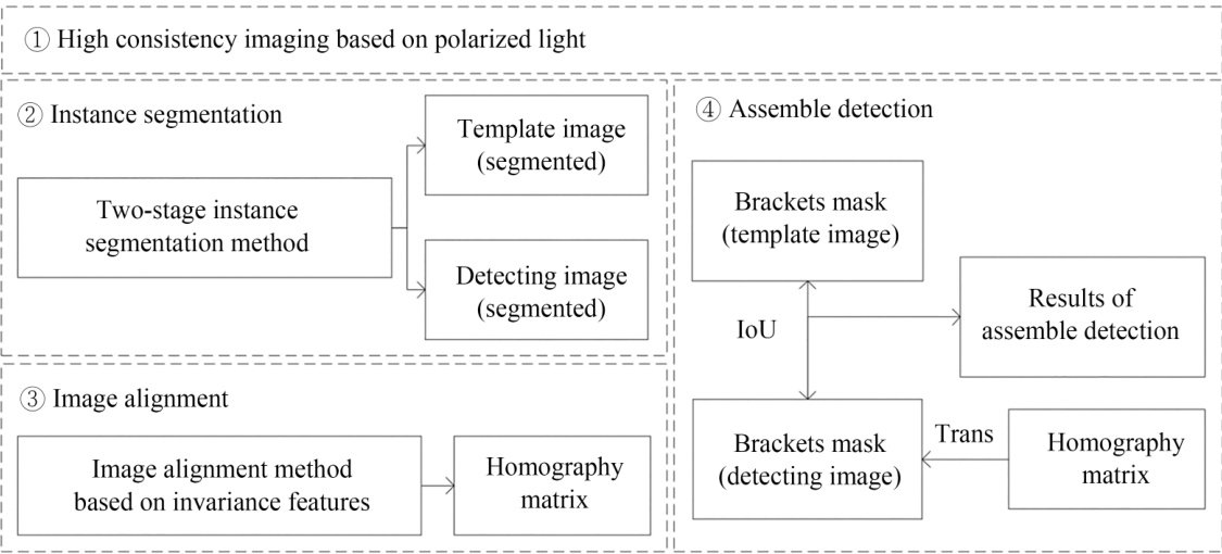 Abstract:To ensure assembly quality,traditional methods rely on manual visual inspection,which often suffers from limited stability and accuracy. Addressing the limitations of existing assembly inspection tech⁃ niques,a vision-based compliance inspection method for wing cable bracket assembly is proposed. To mit⁃ igate missing image information caused by strong reflections from metal brackets,polarization imaging technology is employed to enhance the imaging quality. To resolve the challenge of mixed foreground and background information in the assembly scene,a two-stage instance segmentation algorithm is developed by integrating YOLOv8 with SAM,enabling rapid deployment and precise part segmentation. To com ⁃ pensate for viewpoint discrepancies resulting from repeated positioning errors between the actual standard and the assembly drawing,invariant features are extracted for image alignment. Finally,pixel-level mask intersection over union(IoU)metrics between corresponding parts are calculated to identify incorrect or missing assemblies. Compared to manual inspection,the proposed method substantially improves inspec⁃ tion efficiency. Experimental results validate its effectiveness,demonstrating an accuracy of 96.08% and a recall rate of 100% for misassembled parts,thereby confirming its high deployment efficiency,accuracy, and robustness.
