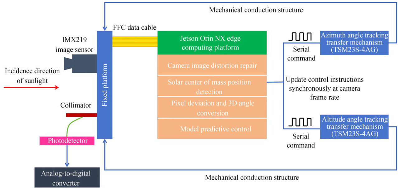 Abstract:A solar tracking system tailored for mobile platforms has been developed to fulfillthe require ment for high-precision solar position tracking in a vehicle-mounted laser heterodyne solar radiation spectrum detection system. This study transfers data processng tasks to an edge computing platform,significantly enhancing processing speed and ensuring rapid system response in dynamic environments. Concur rently,the integration of camera distortion correction and vision detection algorithms enables precise determination of the solar centroid position within the camera image and calculation of the angular offset. This angularoffset serves as the system model's state variable,and the introduction of a model predictive control algorithm facilitates optimal control of the atitude adjustment motor speed,thereby markedly improving tracking accuracy and stability.Experimental results demonstrate a system response delay of only 14.6 ms,with tracking accuracies of 0.13∘ and 0.04∘ along the X⋅ and Y -axes,respectively,when deployed on an onboard platform traveling at 15km/h . The findings confirm that the designed solar tracking system combines high precision with low latency,meeting the stringent demands of heterodyne measurement for precise solar position tracking on vehicle platforms.