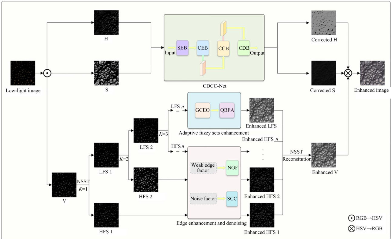 关键词:浮选泡沫;低照度图像;颜色校正;颜色深度编解码网络;多尺度增强与去噪;非下采样剪切波变换;模糊集