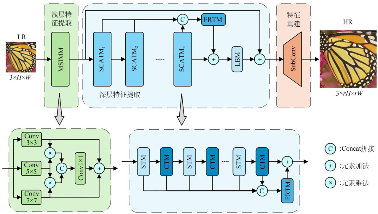 Key words: image super-resolution; transformer; attention mechanism; feature interaction; feature re-use;multi-scale