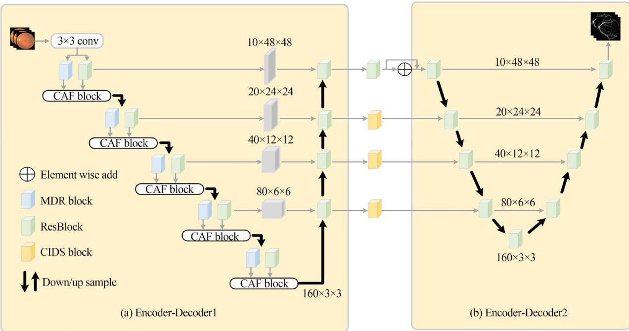 双路径编码和跨级解耦的视网膜血管分割