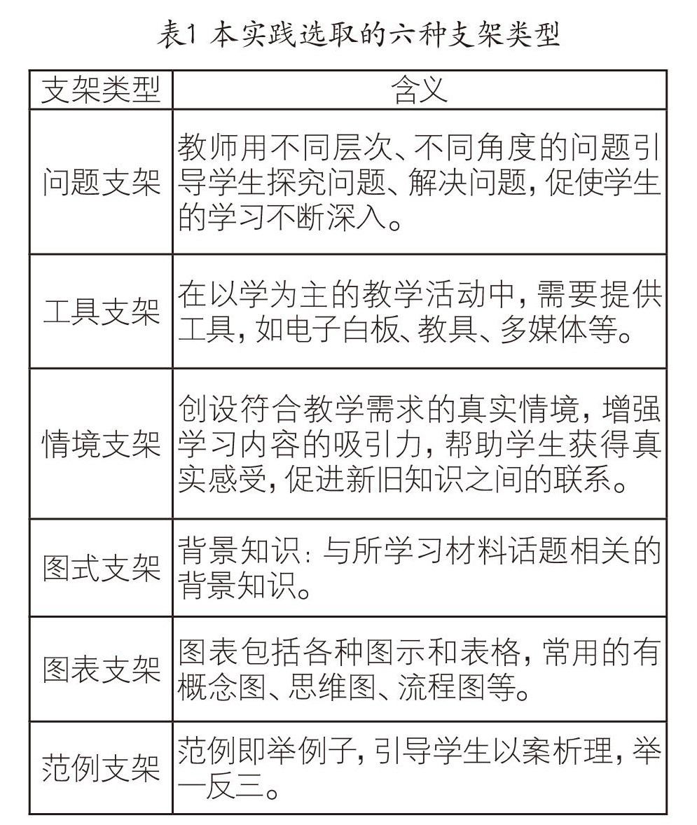 维果茨基认为支架式教学是:教师或同伴为学生的认知发展提供支持从而使他们顺利达到下一个阶段或水平。当教师教授学生新知识时,所设计的教学活动应当是刚刚超出学生现有的知识水平,教师要为学生在新知识和旧知识之间搭建桥梁,激活最近发展区,引导学生掌握、运用新知识。本文选取了六种支架类型(见表1)。