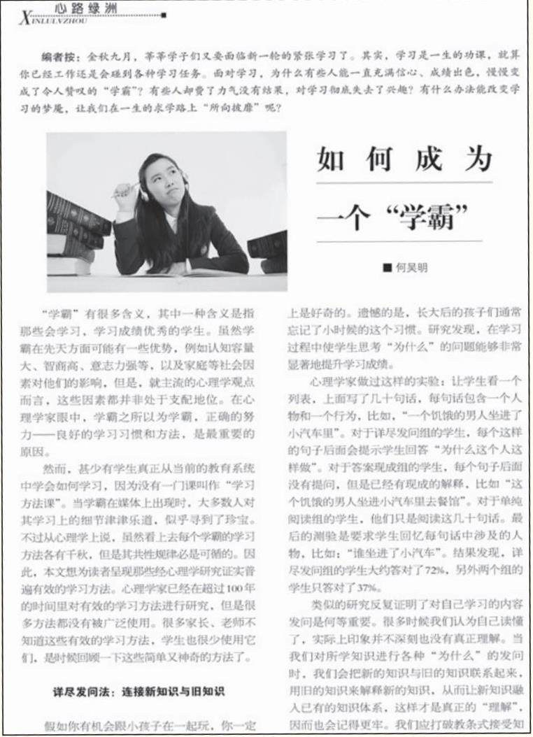 “学霸”有很多种含义,其中一种含义是指那些会学习、学习成绩优秀的学生。虽然学霸在先天方面可能有一些优势,但是,在心理学家眼中,学霸之所以为学霸,正确的努力——良好的学习习惯和方法,是最重要的原因。本文想为各位呈现一些经心理学研究证实普遍有效的学习方法。(剩余3267字)