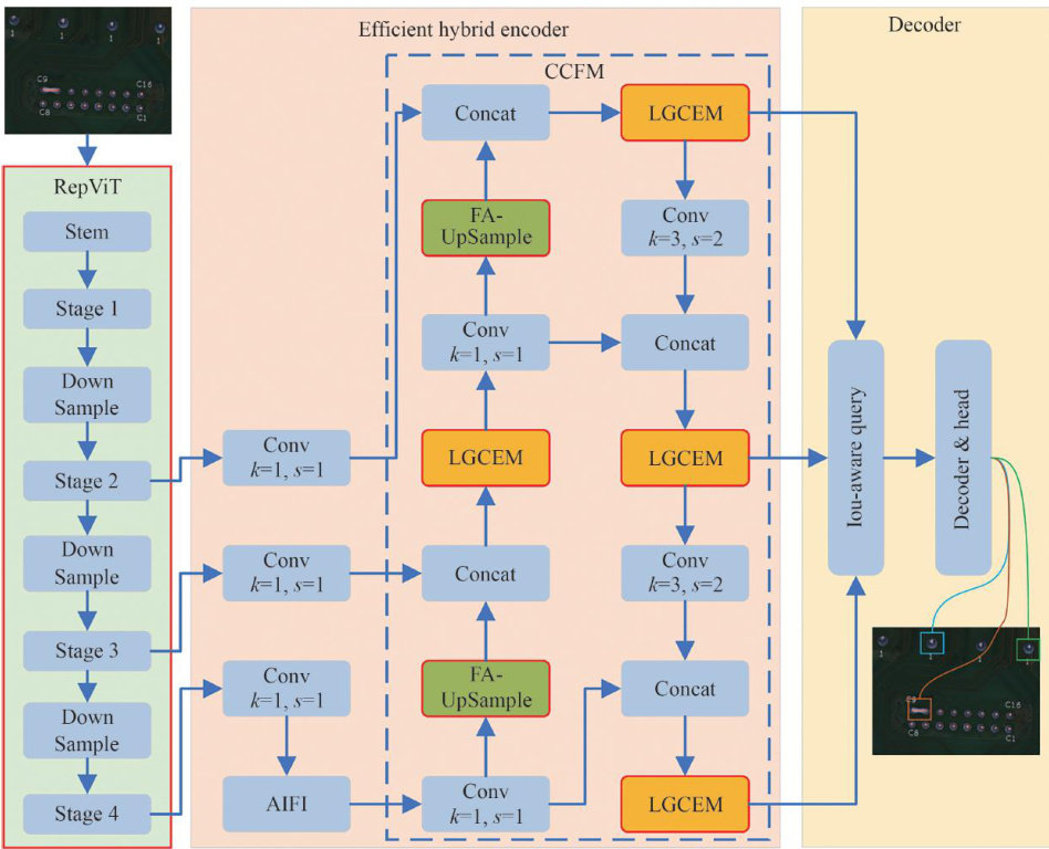 Abstract:To address the chalenges of the slow detection speed and the low accuracy in pin solder defectdetection for printed circuit board assemblies(PCBA),due to small target sizes,dense distributions,and complex backgrounds,this paper proposes an improved RT-DETR-based detection method. First,to overcome the limited global perception capability of the RepC3 module in multi-scale semantic feature fusion,a local and global collborative enhancement module is introduced to enhance the model's global understanding of multi-scale features. Second,a frequency-aware upsampling module is designed to effectively mitigate feature center ofset issues caused by traditional interpolation-based upsampling and to improve the model's responsiveness to key regions. Finally,RepViT is adopted as the backbone network,which improves feature extraction capabilities while significantly reducing model complexity. The proposed method is evaluated on two datasets: a proprietary PCBA pin solder joint image dataset collcted and annotated by ourselves on industrial production line and the public PKU-Market-PCB dataset. On the PCBA dataset,compared with the original RT-DETR,the proposed method achieves a 31. 44% reduction in model parameters,a 29.21% reduction in computational cost,a 9.88% improvement in mAP50 ,and an inference speed increase to 84.74 FPS. On the PKU-Market-PCB dataset, it yields gains of 6.75% in mAP50 and 23.10% in inference speed.Overall,the proposed method significantly enhances detection accuracy and eficiency while maintaining a balance between computational cost and real-time performance,demonstrating strong potential for practical engineering applications and further research.