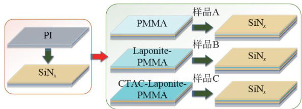 Abstract: To address the loss of flexibility and increased risk of side penetration in commercially applied inorganic/organic composite encapsulation films—issues often resulting from overly thick organic layers, this study investigates strategies for synergistically optimizing the barier properties and interlayer adhesion of thinned organic layers.We constructed a thinned “sandwich-structured”composite film by incorporating synthesized lithium magnesium silicate (Laponite) nanosheets,both pristine and modified with cetyltrimethylammonium chloride(CTAC),into a polymethyl methacrylate(PMMA) matrix,which was then laminated with silicon nitride( SiNx )layers. The results demonstrate that the incorporated nanosheets significantly enhance the water vapor barrer performance by creating a tortuous diffsion path. Compared to the pristine Laponite system,the CTAC-modified nanosheets,owing to their hydrophobic surface and superior dispersion within the PMMA matrix,led to a remarkable improvement in the overall performance of the CTAC-Laponite-PMMA composite. The resulting film exhibited an ultra-low surface roughness of 0.312nm ,ensuring excellent interfacial adhesion with the adjacent inorganic layers. Consequently, the water vapor transmisson rate(WVTR) of the entire sandwich structure was further reduced to 5.90× (204号 10-5g/(m2⋅day) . This work demonstrates a novel approach to co-optimizing barrier properties and interfacial adhesion in thinned organic layers via organically modified nanosheets,ofering a promising pathway for developing high-performance,ultra-thin flexible encapsulation.