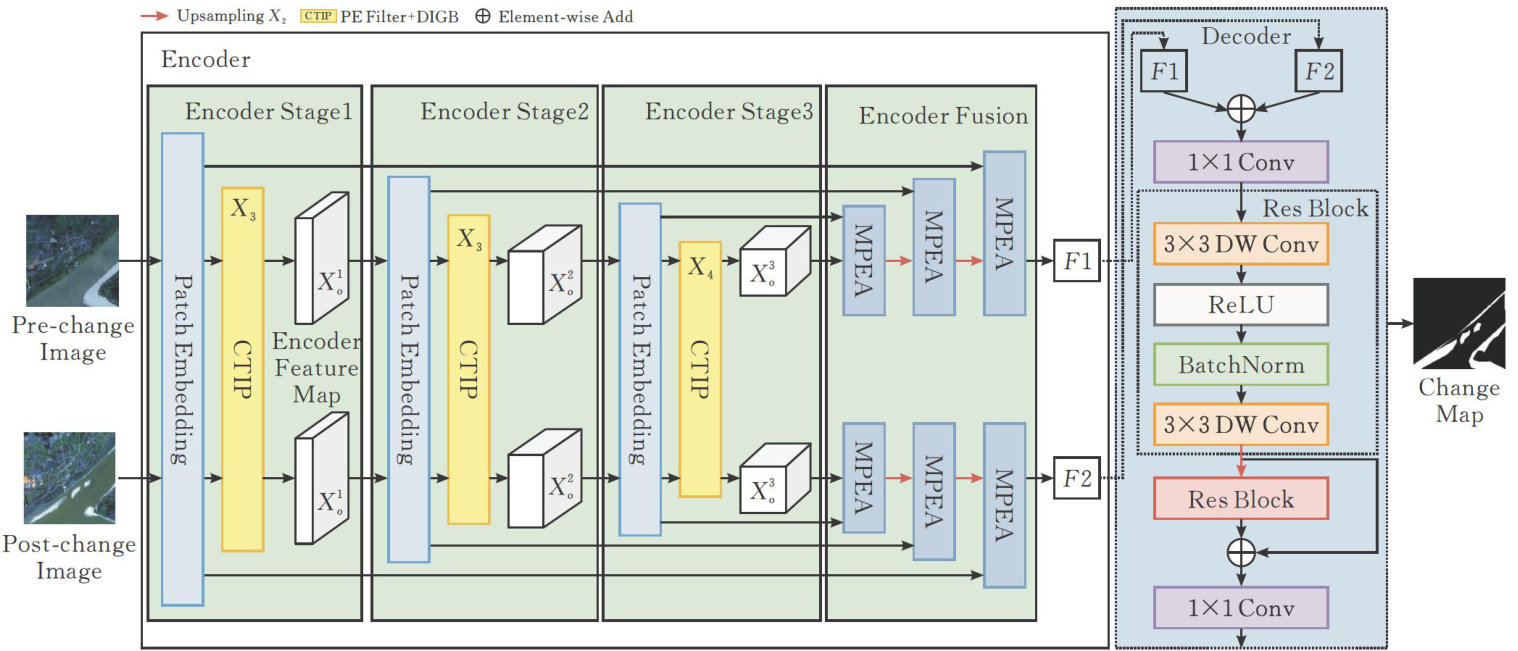 遥感变化检测是通过对比不同时间点的遥感影像信息,识别和分析水体变化情况的技术,广泛应用于监测水体面积变化、跟踪水资源利用等领域,为国家水资源管理提供了科学的决策依据[]。变化检测任务面临的核心挑战之一是如何有效克服不同时相间的特征污染,精确识别语义变化区域[2]。(剩余10799字)