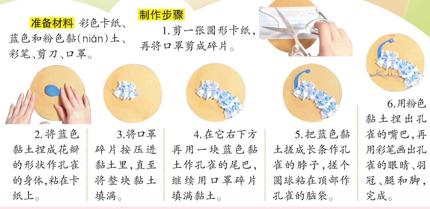 4.在它右下方再用一块蓝色黏土作孔雀的尾巴,继续用口罩碎片填满黏土。(剩余82字)