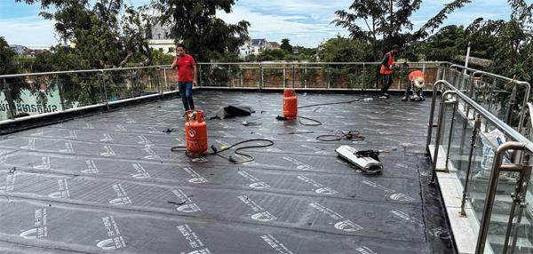 贺建葛在金边防水材料施工项目现场。图/受访者提供