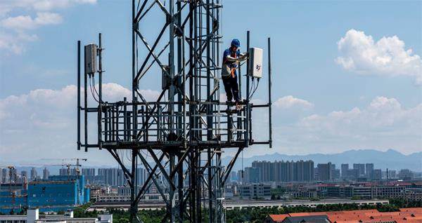 2025年7月5日,浙江省金华市一处5G基站,无线网络工程师在通信塔上检修5G设备。图/视觉中国