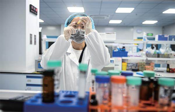 在盛世泰科生物医药技术(苏州)有限公司实验室,工作人员观察化合物配制状态。图/新华