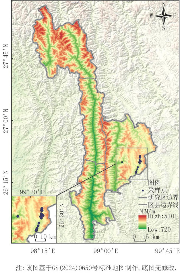 研究区位于云南省西北部, 26∘22′~26∘34′N 99∘13′~99∘26′E. 采样区属于低纬高原季风气候,四季不分明,干湿季节分明.平均海拔超过 2240m 一年内有霜期 175d ,最高气温可达 31.5∘C ,土壤以紫色土为主,主要种植小麦、玉米、马铃薯等作物.在研究区采集了旱田土壤和农产品一对一的有效样点,共采集31对样点.采集玉米(ZeamaysL.)等谷物类样品12个,马铃薯(Solanumtuberos-umL.)等薯类作物样品12个,白菜(Brassicarapavar.glabraRegel)等叶菜蔬菜样品7个.