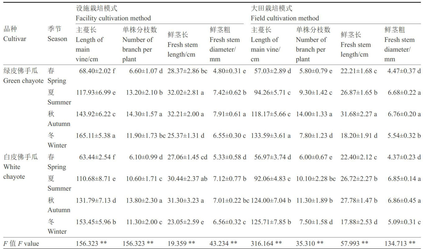 Abstract:Toprovideatheoreticalbasisforhigh-yieldandhigh-qualitycultivationofchayote,themaincultivarsof green chayote and white chayote in western Yunnan were planted with equal row spacing under two different cultivation methods:Facilitycultivationandfieldcultivation.Theagronomictraitsandyieldcharacteristicsofchayotewereinvestigated, andthemainfunctionalnutrientsofchayote vinewereanalyzed.Theresults showedthatthecomprehensiveeffects ofcultivars,cultivation methods andseasons had extremely significant effcts onthegrowthand yieldofchayote.Insummer and autumn,chayote plants exhibitedvigorous growth,increased branching,andashorter harvesting period,with the yieldofchayotevine frombothcultivarsbeingsignificantlyhigherthaninspringand winter.Underfacilitycultivation, theyieldofchayote vineforbothcultivarsacrossdifferentseasons wassignificantlyhigher than fieldcultivation,withannual total yields increasing by 34.61% and 22.33% ,respectively.Amongthe two cultivars,greenchayote demonstrated superior plant growth and yield potential compared to whitechayote.No significant diference was observed inthecontent of polysaccharides,totalphenols,andtotalflavonoidsinchayotevineamongdiferentcultivars,cultivationmethods,or seasons.However,the watercontentofchayote vine was significantly influenced byseasonalchanges,with bothcultivars showingthe highest watercontentinsummer,indicating similar eatingquality.Therefore,cultivating these two chayote cultivars inthe south subtropicalregion can enableyear-round productionand staggered market supplyofchayote vine. Theoptimal combination identified in this studyis facilitycultivationof greenchayote. Key words: Chayote(Sechium edule); Chaylte vine; Agronomic traits; Eating quality; Adaptability