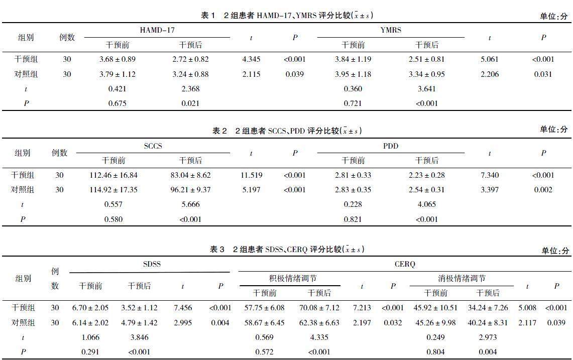 【摘要】 目的 探究愉快因子回输式护理对双相情感障碍(BPD)缓解期患者心理健康的影响。方法 选取2019年3月—2020年8月于上饶市第三人民医接受治疗的60例BPD缓解期患者,按随机数字表法分为干预组和对照组各30例。对照组患者采用常规心理干预,干预组患者在此基础上采用愉快因子回输式护理干预,2周为1个疗程,治疗4个疗程。(剩余5175字)