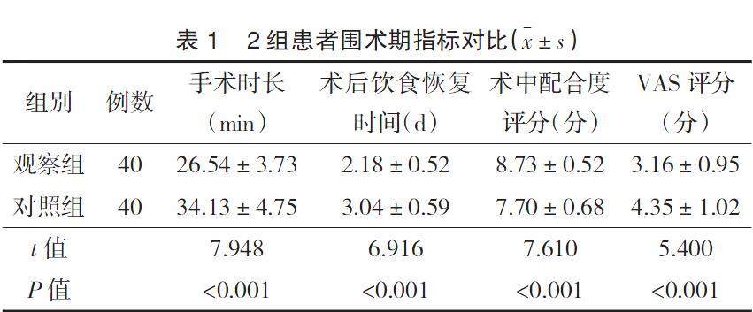 【摘要】 目的 探讨行内镜下肠息肉切除术患者采用基于信息-动机-行为(IMB)模型的护理干预效果。方法 以随机数字表法将2020年1月—2021年6月南昌大学第四附属医院收治的行内镜下肠息肉切除术患者80例分为2组,各40例,观察组采用基于IMB模式的护理干预,对照组采用常规护理,统计2组围术期手术时长、术后饮食恢复时间,评估2组术中配合度(术中配合度评分)及疼痛程度[视觉模拟评分(VAS)法评分];评估2组术前及术后的心理状况[抑郁自评量表(SDS)及焦虑自评量表(SAS)评分];调查2组护理满意度;统计2组术后愈合相关并发症发生情况。(剩余5708字)