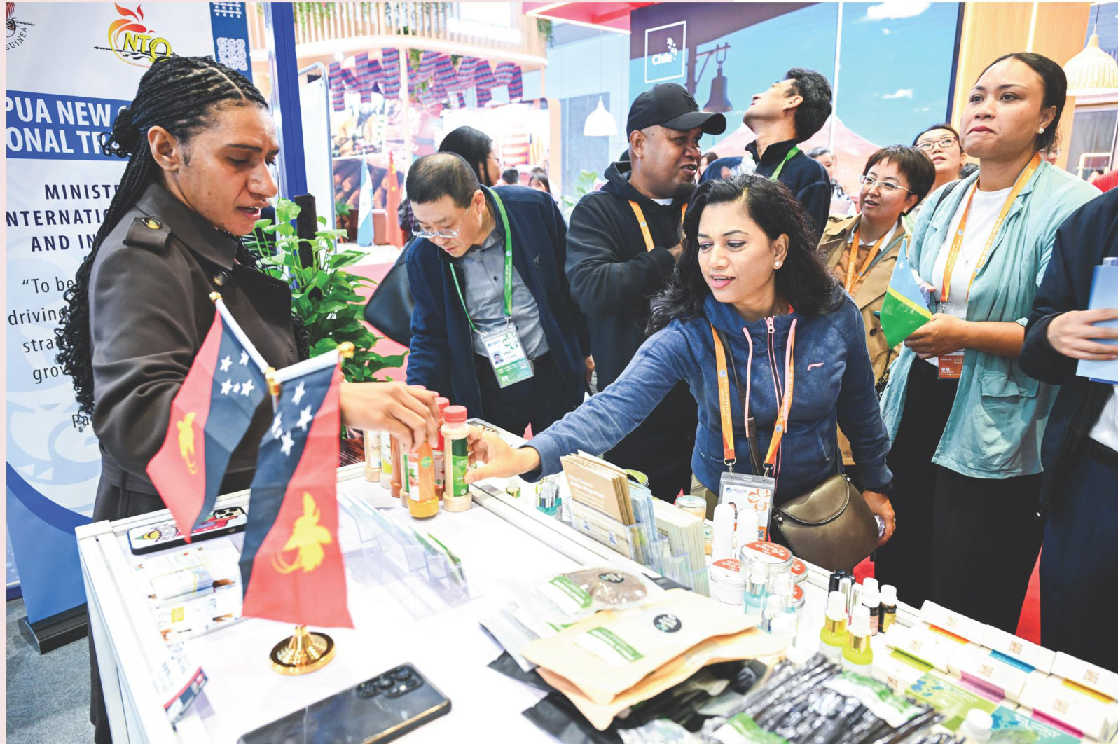 11月8日,在第八届进博会上,来自全球南方国家和地区的参展商在进博会上寻找商贸机会。图为观众在巴布亚新几内亚国家馆展台参观该国特色产品。