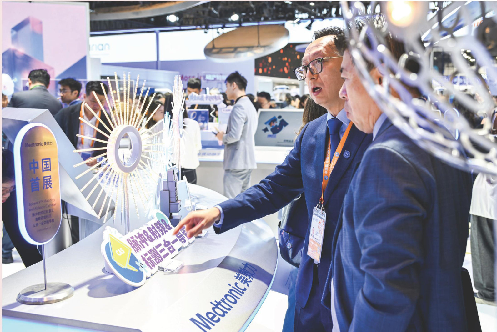 11月6日,在第八届进博会医疗器械及医药保健展区,观众在美敦力Medtronic展台参观中国首展的脉冲、射频和标测三合一全功能导管。