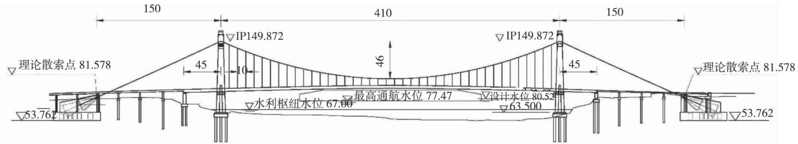 南宁英华大桥位于南宁市区,起于江南区,向东跨越邕江连接至青秀区.该桥主桥为单主缆悬索桥,主缆跨度布置为( 150+410+150⟩ ) m ,矢跨比1/9,采用预制平行高强钢丝索股结构.吊索仅布置于中跨,共40对,标准间距 10m (剩余9860字)