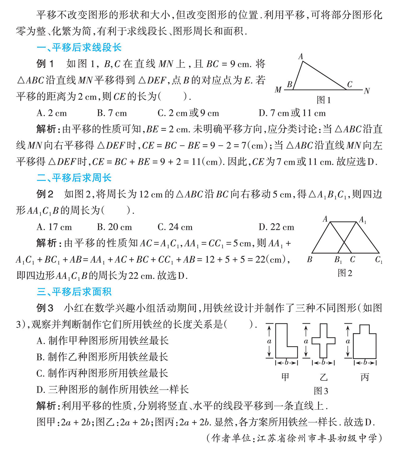 平移不改变图形的形状和大小,但改变图形的位置.利用平移,可将部分图形化零为整、化繁为简,有利于求线段长、图形周长和面积.