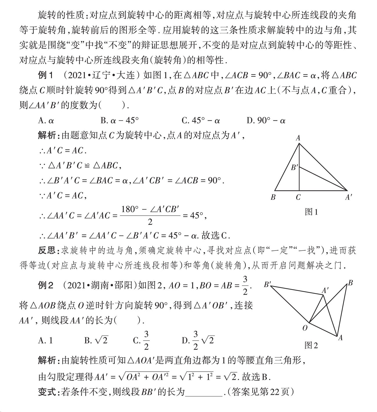 旋转的性质:对应点到旋转中心的距离相等,对应点与旋转中心所连线段的夹角等于旋转角,旋转前后的图形全等. 应用旋转的这三条性质求解旋转中的边与角,其实就是围绕“变”中找“不变”的辩证思想展开,不变的是对应点到旋转中心的等距性、对应点与旋转中心所连线段夹角(旋转角)的相等性.