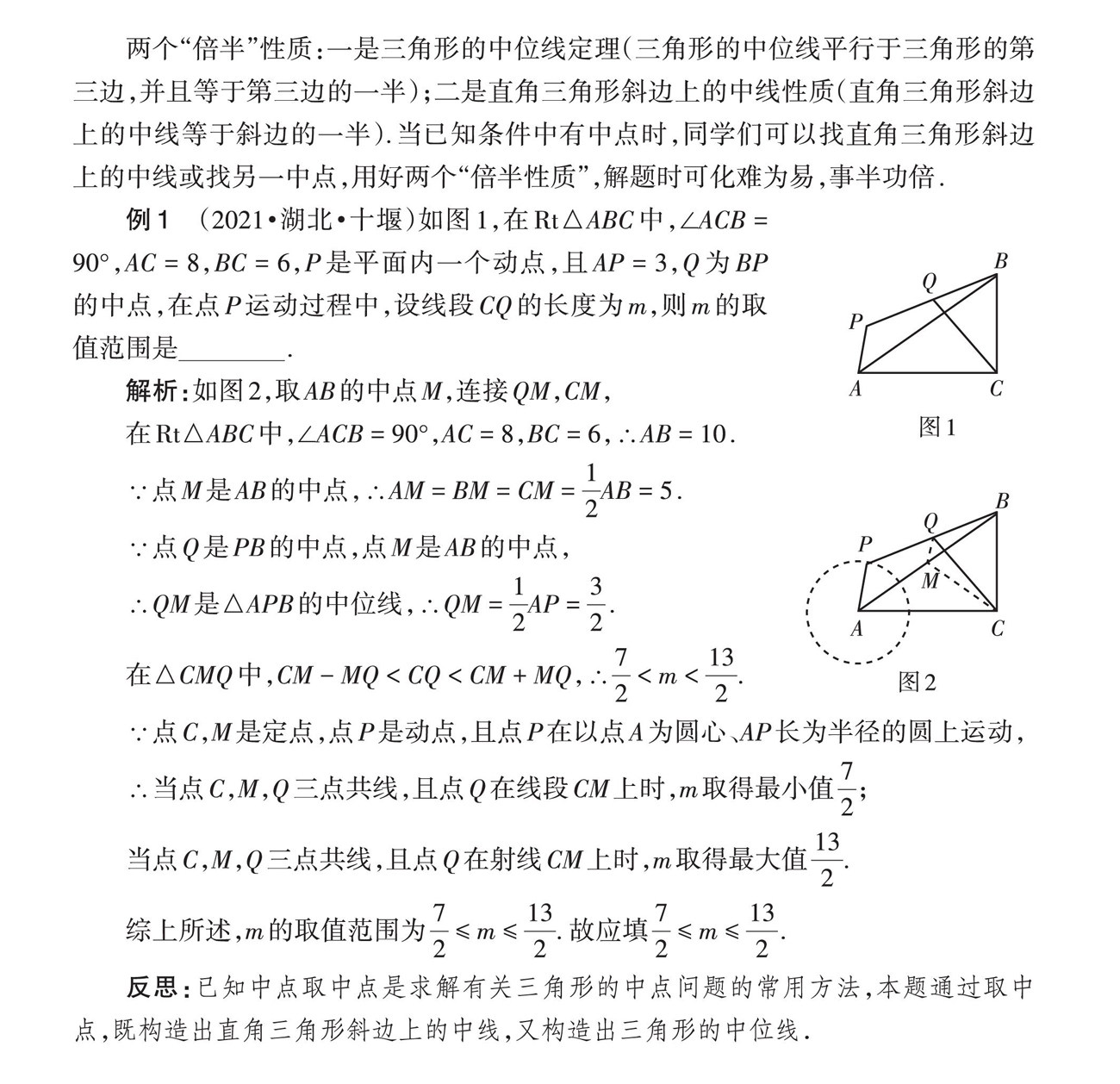两个“倍半”性质:一是三角形的中位线定理(三角形的中位线平行于三角形的第三边,并且等于第三边的一半);二是直角三角形斜边上的中线性质(直角三角形斜边上的中线等于斜边的一半).当已知条件中有中点时,同学们可以找直角三角形斜边上的中线或找另一中点,用好两个“倍半性质”,解题时可化难为易,事半功倍.