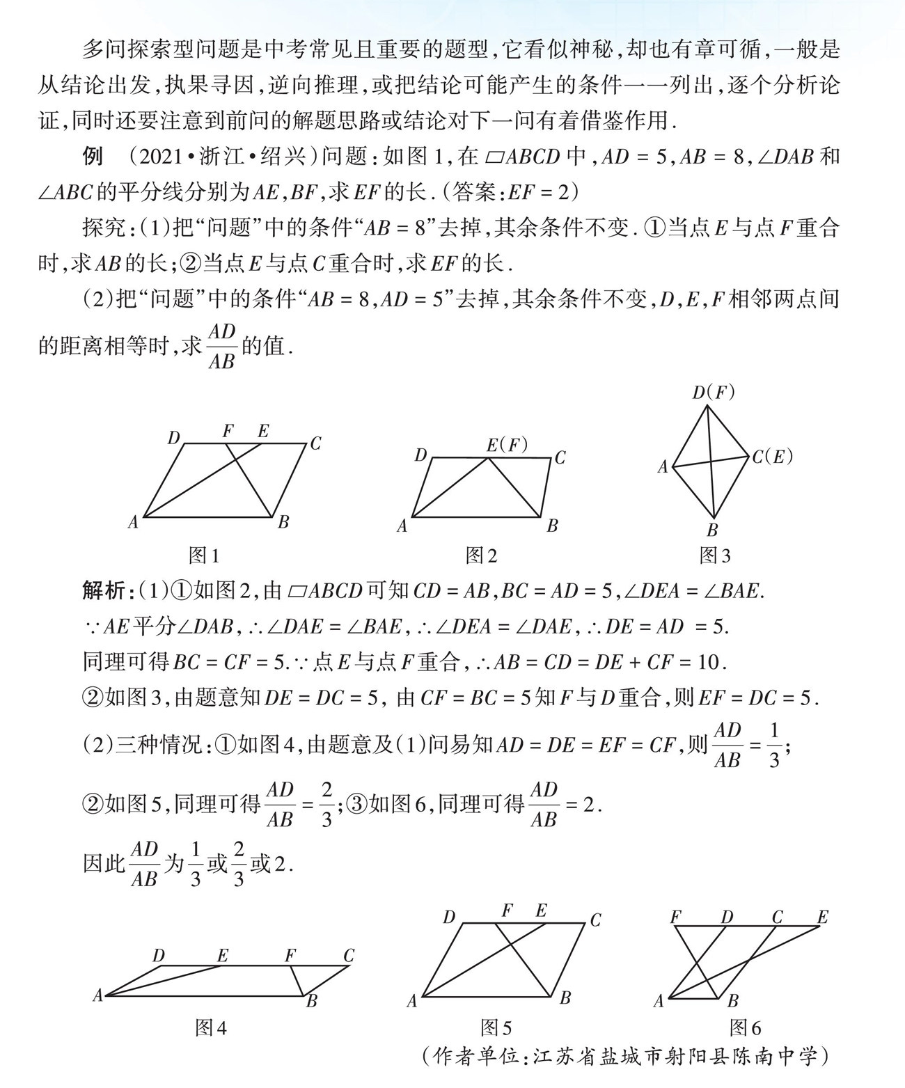 多问探索型问题是中考常见且重要的题型,它看似神秘,却也有章可循,一般是从结论出发,执果寻因,逆向推理,或把结论可能产生的条件一一列出,逐个分析论证,同时还要注意到前问的解题思路或结论对下一问有着借鉴作用.