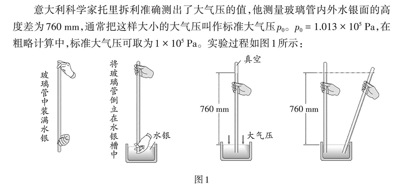 意大利科学家托里拆利准确测出了大气压的值,他测量玻璃管内外水银面的高度差为760 mm,通常把这样大小的大气压叫作标准大气压p0。(剩余1157字)
