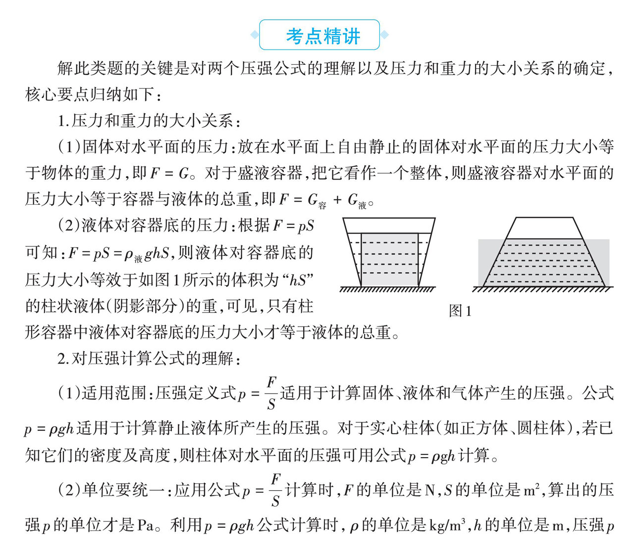 固体、液体压强的综合计算是力学的重点和难点,更是中考命题的热点。此类计算题综合性强、难度大,下面通过考点精讲和典例精析,帮助同学们加以突破。
