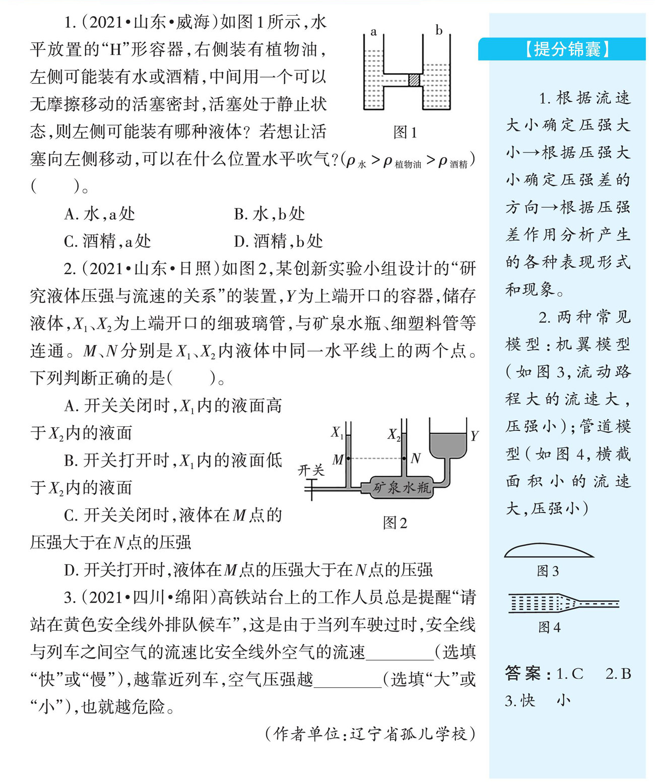 1. (2021·山东·威海)如图1所示,水平放置的“H”形容器,右侧装有植物油,左侧可能装有水或酒精,中间用一个可以无摩擦移动的活塞密封,活塞处于静止状态,则左侧可能装有哪种液体?若想让活塞向左侧移动,可以在什么位置水平吹气?(ρ水 > ρ植物油 > ρ酒精)( )。