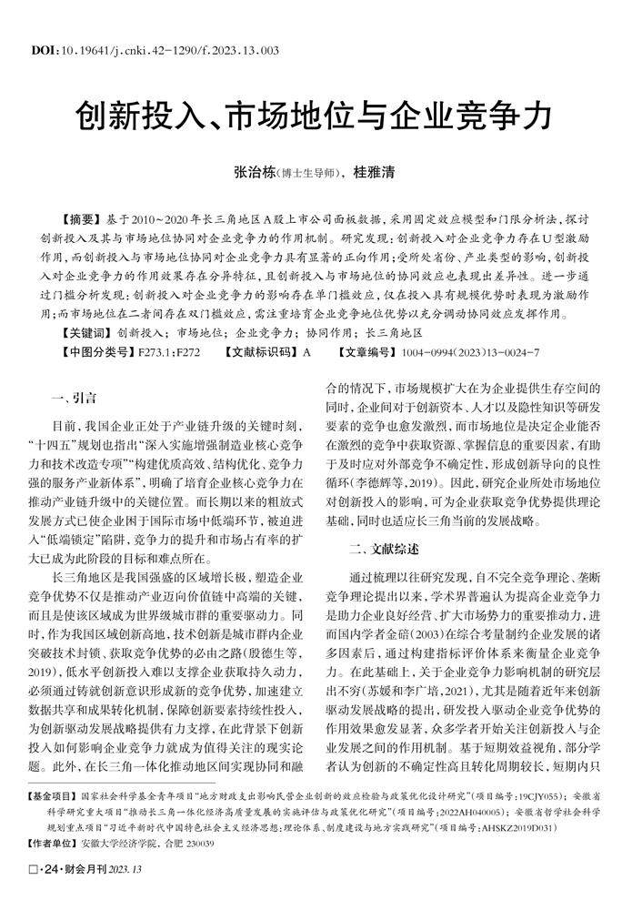【摘要】基于2010 ~ 2020年长三角地区A股上市公司面板数据, 采用固定效应模型和门限分析法, 探讨创新投入及其与市场地位协同对企业竞争力的作用机制。研究发现: 创新投入对企业竞争力存在U型激励作用, 而创新投入与市场地位协同对企业竞争力具有显著的正向作用;受所处省份、 产业类型的影响, 创新投入对企业竞争力的作用效果存在分异特征, 且创新投入与市场地位的协同效应也表现出差异性。(剩余11900字)