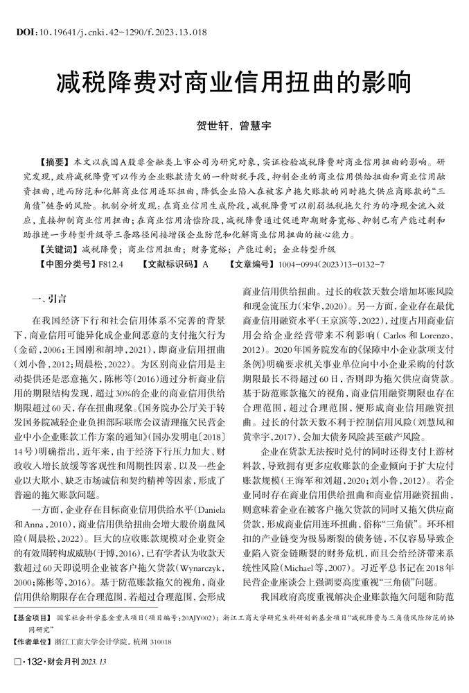 【摘要】本文以我国A股非金融类上市公司为研究对象, 实证检验减税降费对商业信用扭曲的影响。研究发现, 政府减税降费可以作为企业账款清欠的一种财税手段, 抑制企业的商业信用供给扭曲和商业信用融资扭曲, 进而防范和化解商业信用连环扭曲, 降低企业陷入在被客户拖欠账款的同时拖欠供应商账款的“三角债”链条的风险。(剩余13164字)