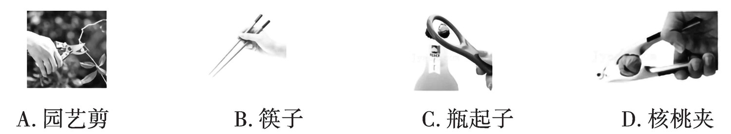 解析:A. 根据生活经验可知园艺剪是省力杠杆;B. 在使用中,只有前面那根筷子在转动,拇指与食指夹住的位置为支点,被夹物体给筷子的力是阻力,食指和中指给筷子施加的力是动力,明显可以看出动力臂小于阻力臂,是费力杠杆;C. 在开瓶过程中,瓶起子上方的卡点在瓶盖上卡住不动,瓶盖给瓶起子向下的力是阻力,人手向上的力是动力,明显动力臂大于阻力臂,是省力杠杆;D. 通过生活经验可知核桃夹是省力杠杆。(剩余602字)