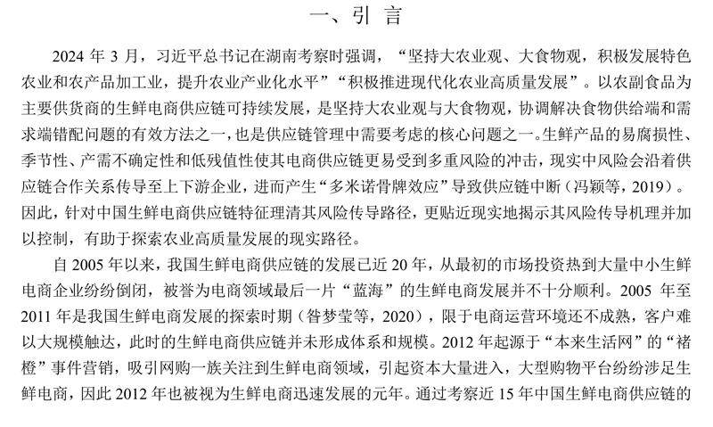2024年3月,习近平总书记在湖南考察时强调,“坚持大农业观、大食物观,积极发展特色农业和农产品加工业,提升农业产业化水平”“积极推进现代化农业高质量发展”。以农副食品为主要供货商的生鲜电商供应链可持续发展,是坚持大农业观与大食物观,协调解决食物供给端和需求端错配问题的有效方法之一,也是供应链管理中需要考虑的核心问题之一。(剩余161字)