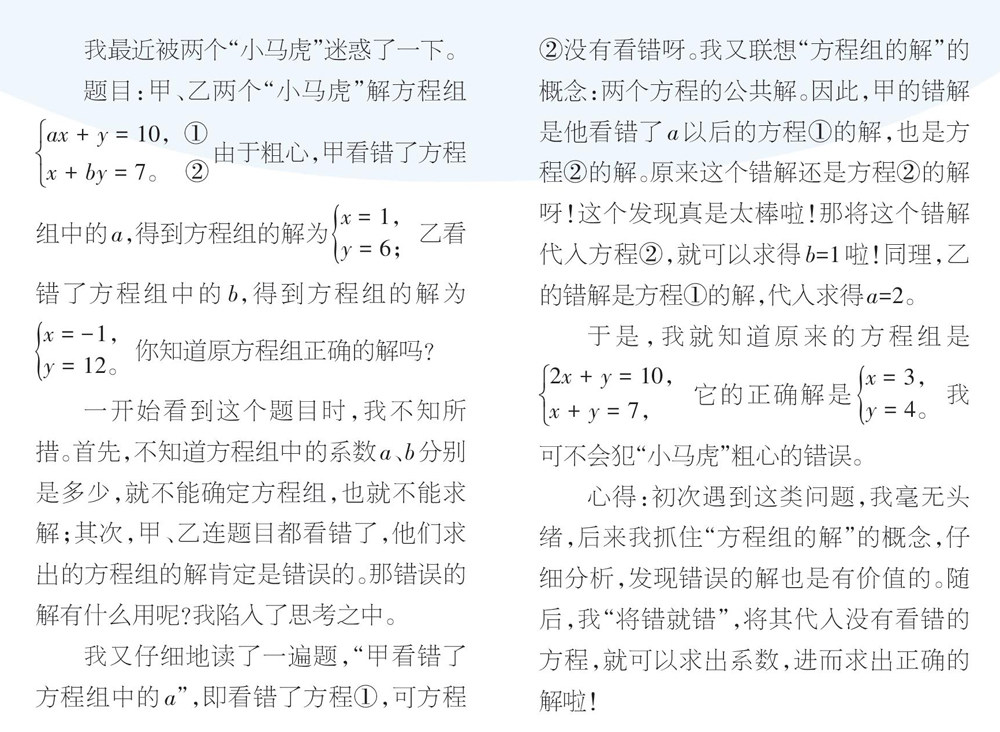 题目:甲、乙两个“小马虎”解方程组[ax+y=10,①x+by=7。 ②]由于粗心,甲看错了方程组中的a,得到方程组的解为[x=1,y=6;]乙看错了方程组中的b,得到方程组的解为[x=-1,y=12。]你知道原方程组正确的解吗?